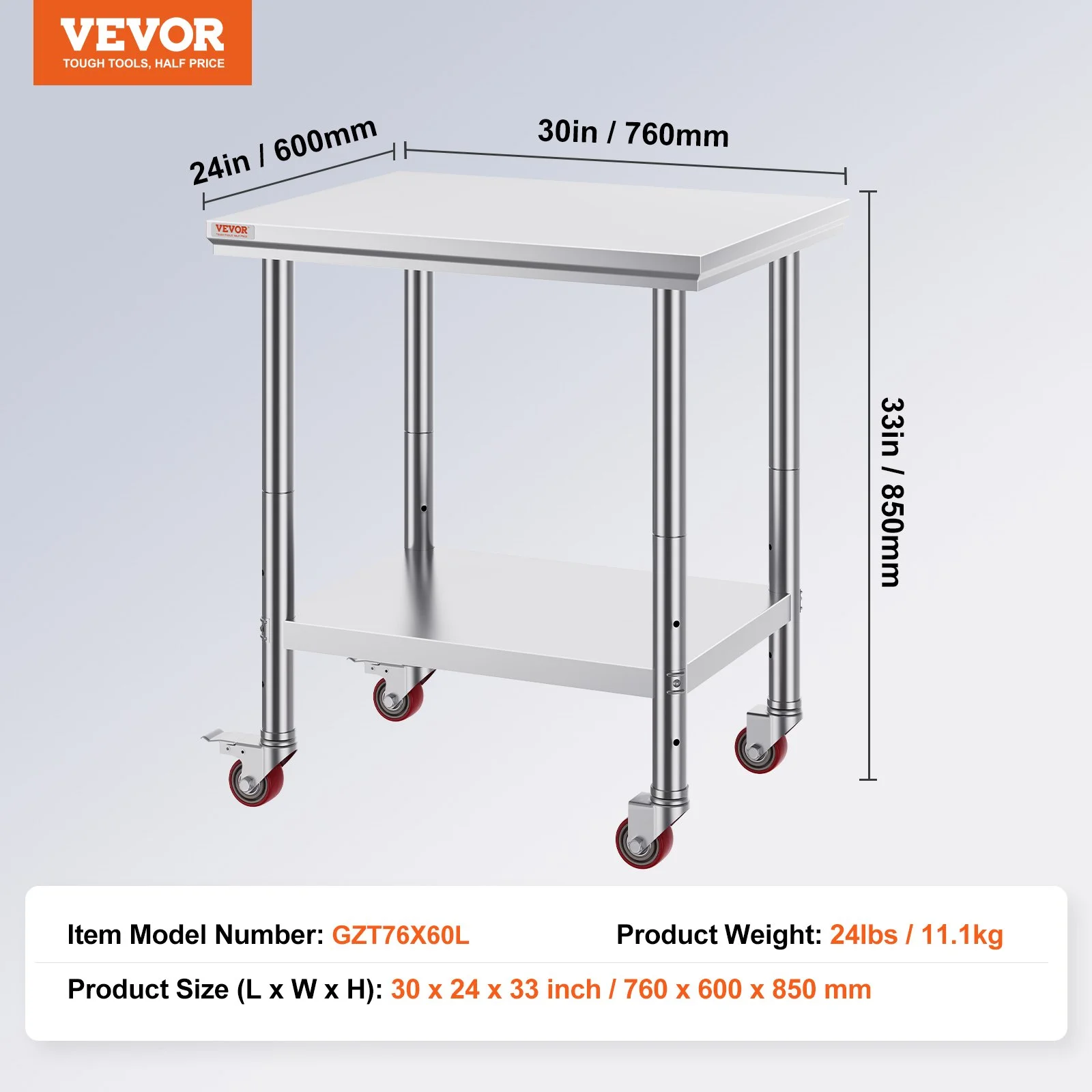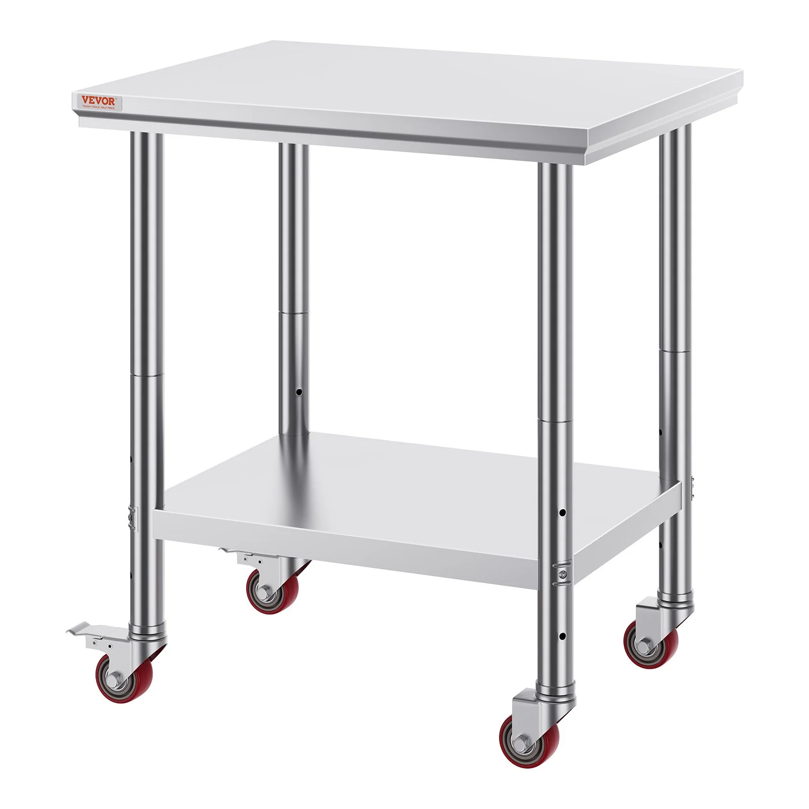 VEVOR 30x12x34 Inch Stainless Steel Work Table 3-Stage Adjustable Shelf with 4 Wheels Heavy Duty Commercial Food Prep Worktable with Brake for Kitchen Prep Work