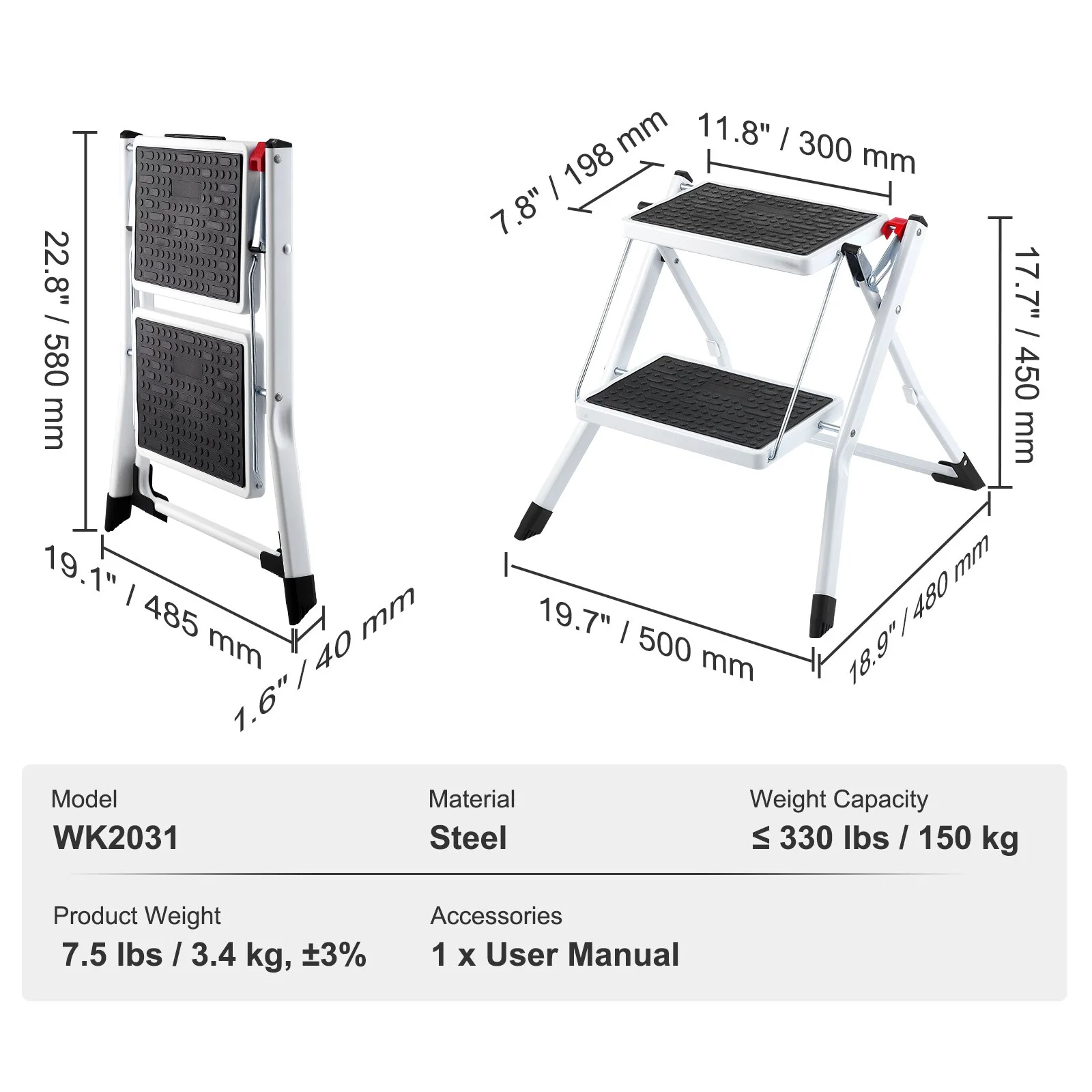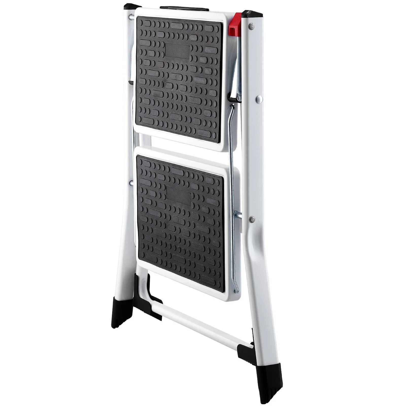 Our two-step step stool is designed for quick and easy folding. Equipped with a convenient lock, simply press the red lock to fold it down swiftly, making it easy to open for use and store when not in use. The dimensions of this two-step step stool when opened are 19.7" L x 18.9" W x 17.7" H, with a step height of 17.5" / 445 mm, perfect for everyday household needs.
