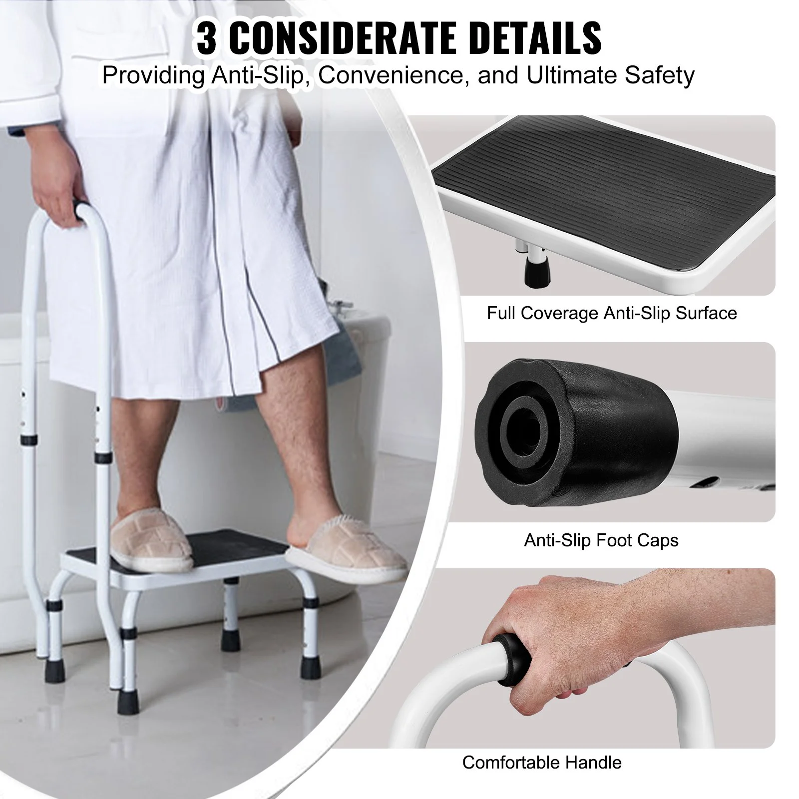 The step stool's platform features a full-coverage anti-slip layer for secure footing, and the handrail has non-slip rubber grips for comfortable holding. Thick rubber foot covers on all four stool legs increase friction, ensuring safe use even on smooth tile floors. Every detail is designed with your safety in mind.