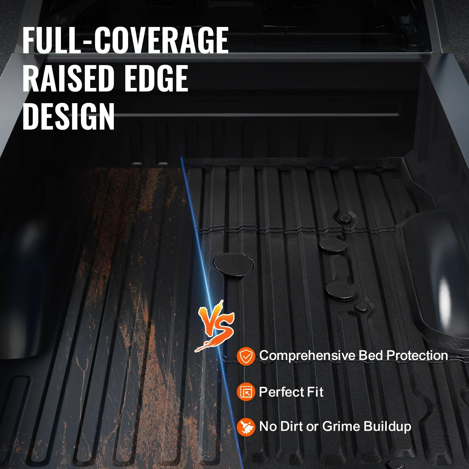 The elevated edge design around the bed mat for truck effectively blocks rainwater, mud, and snow from entering underneath, preventing accumulation that can lead to dirt.