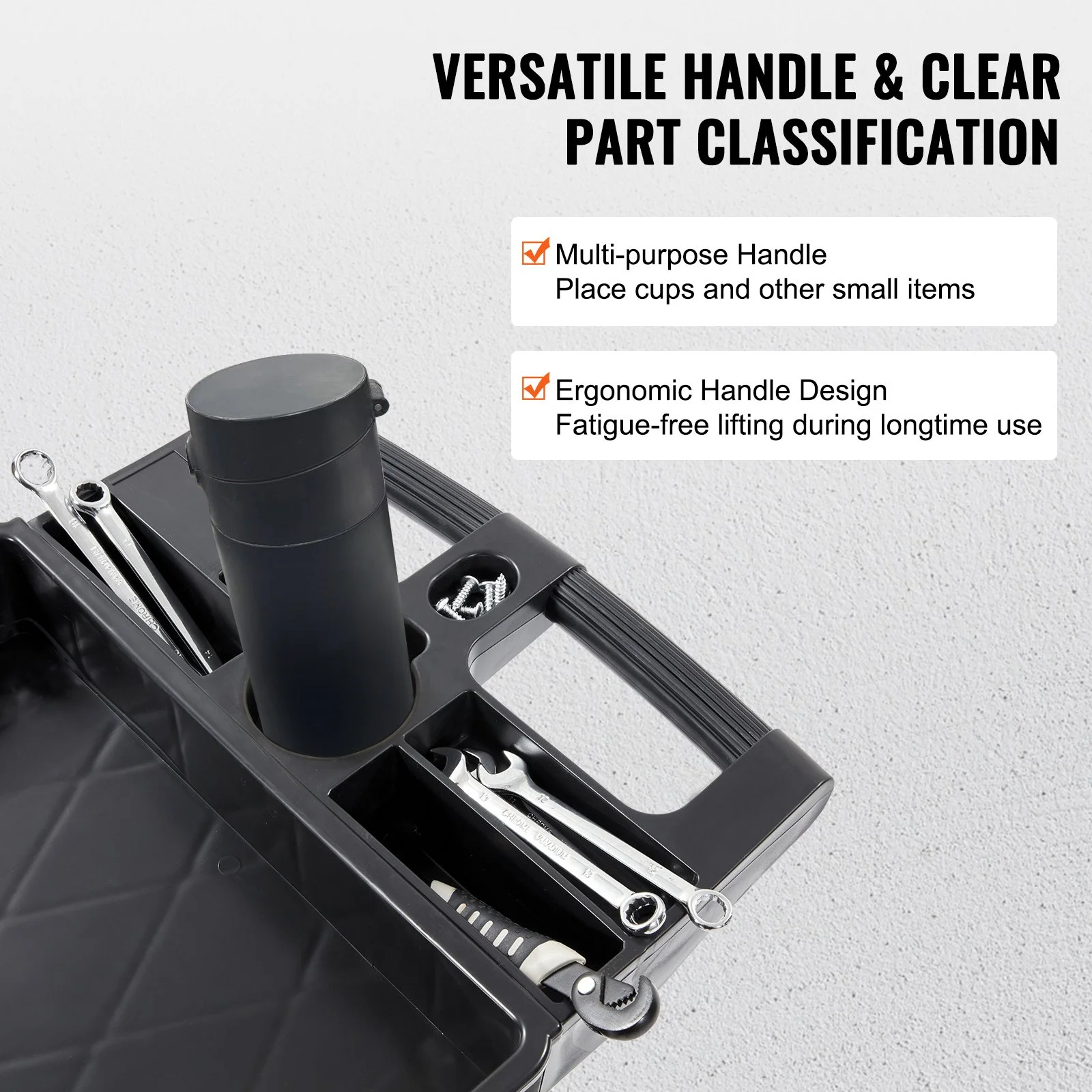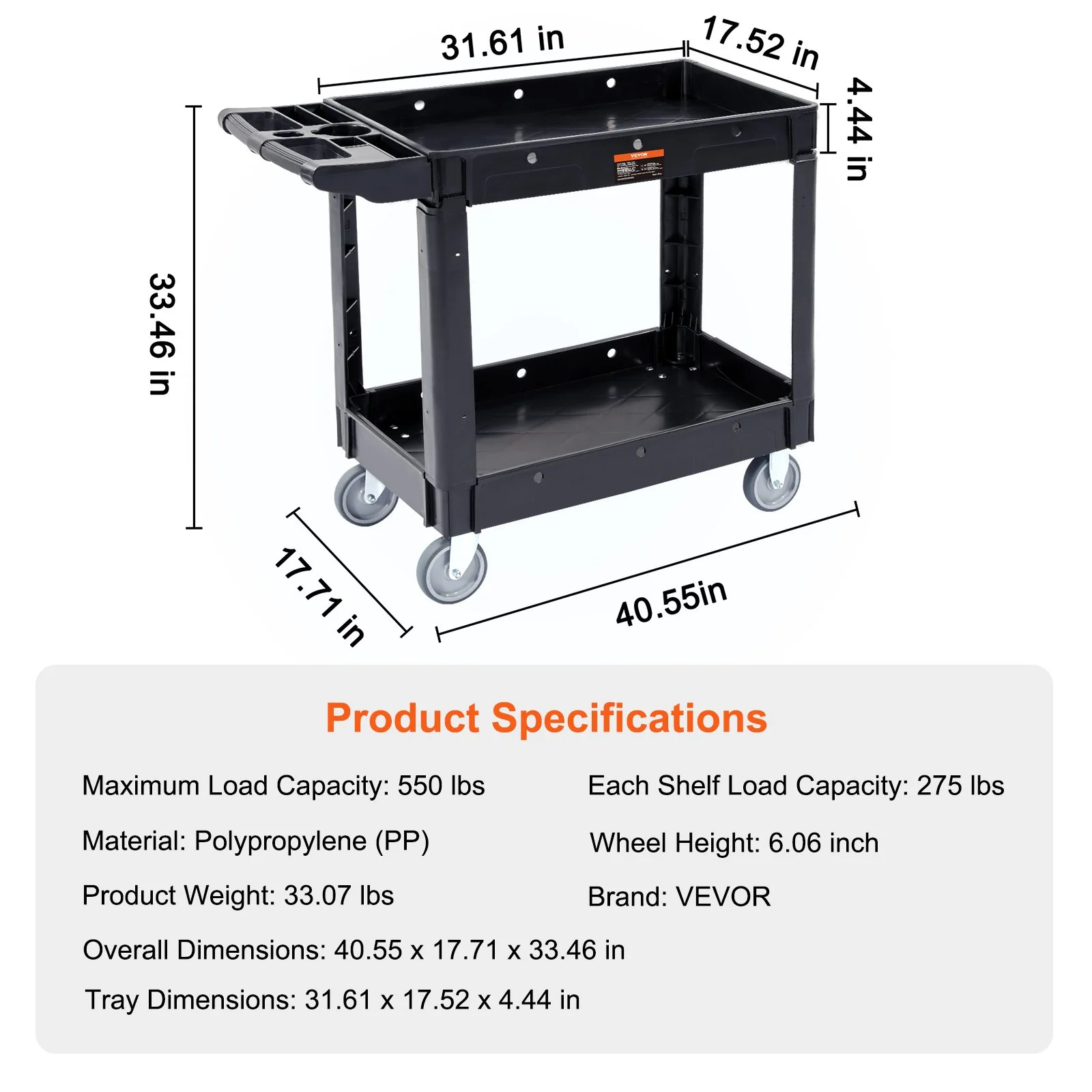 VEVOR 2-tier utility cart can effortless transport 550 lbs heavy loads, such as oversized cartons, large filing cabinets, and hefty toolboxes. Quality polypropylene material is corrosion-resistant, impervious to debris, and easy to clean. High-density structural foam construction makes this cart utility cart sturdy, lightweight, and maneuverable, ideal for long-term heavy-duty transportation needs.