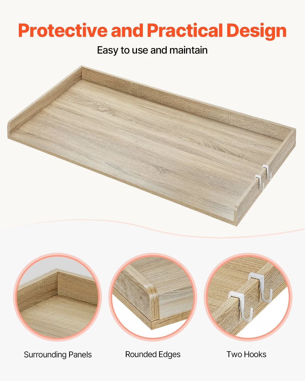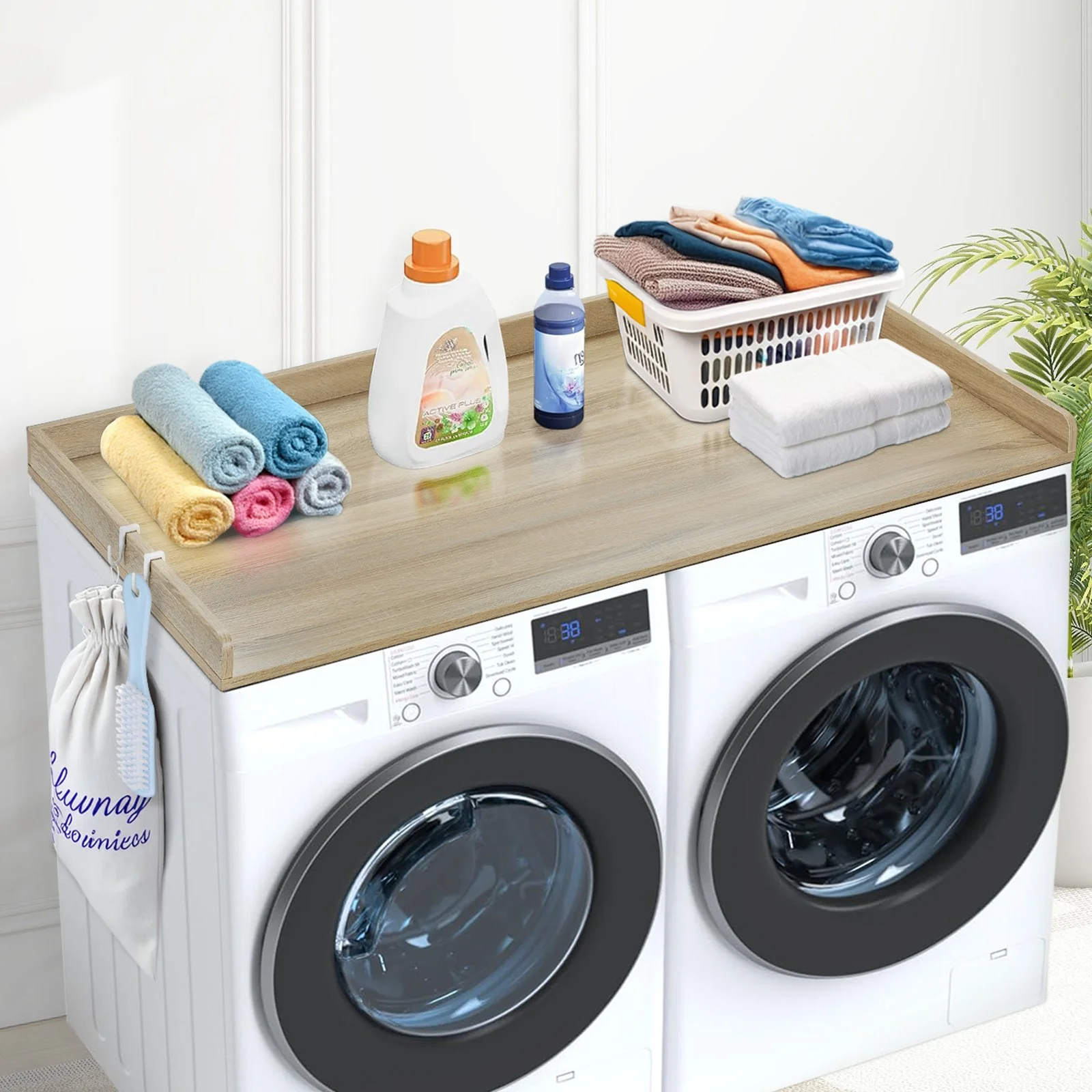 This washer dryer countertop features side hooks, perfect for hanging everyday items like cloths, lint rollers, and more. Convenient to access and keeps everything organized, ensuring a clean and tidy look.