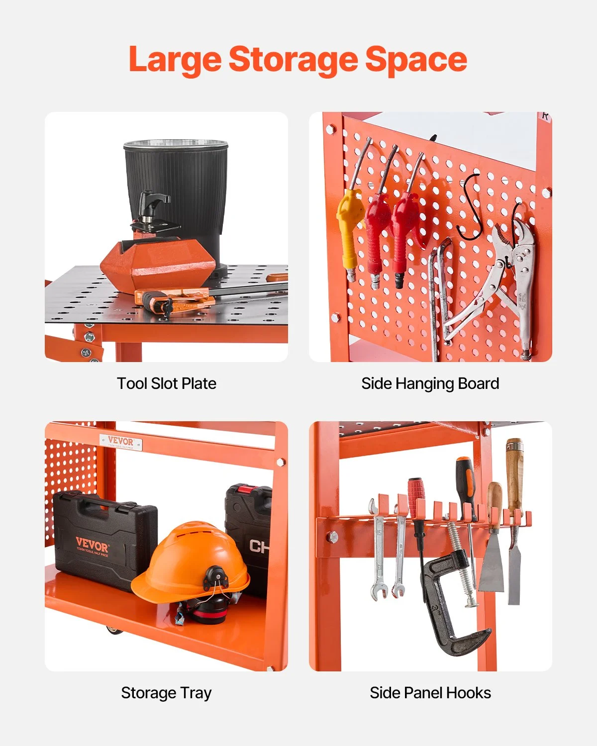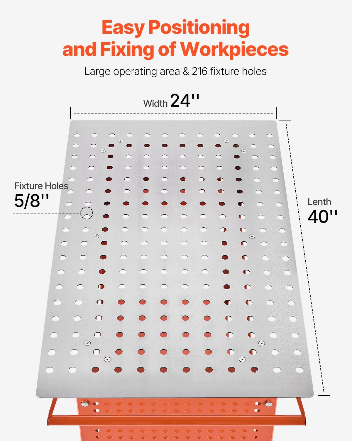 216 5/8-inch fixture holes makes this welding bench easy to clamp your fixtures, while the innovative double-layer storage board design doubles your storage capacity. Keep your tools within arm's reach with the convenient side tool hanging board and 11 hooks.