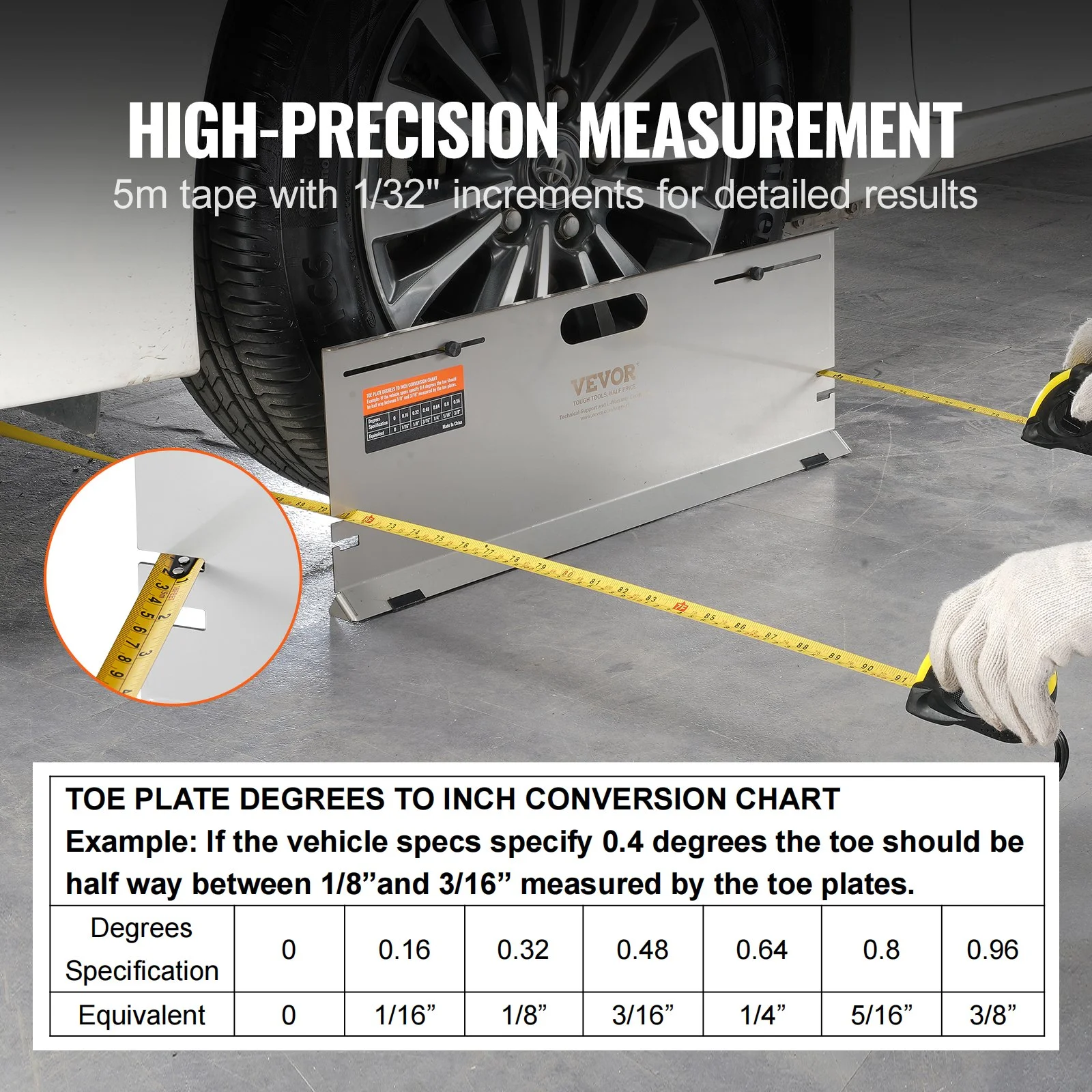 No tire removal is required. Measure the toe angle on the hub directly with our adjustable alignment rods (10.5"-21.2"). This measurement method minimizes inaccuracies caused by tire bumps or sidewall inscriptions. Included two 5m tape measures with precise 1/32" increments and professional guidance for effortless operation.