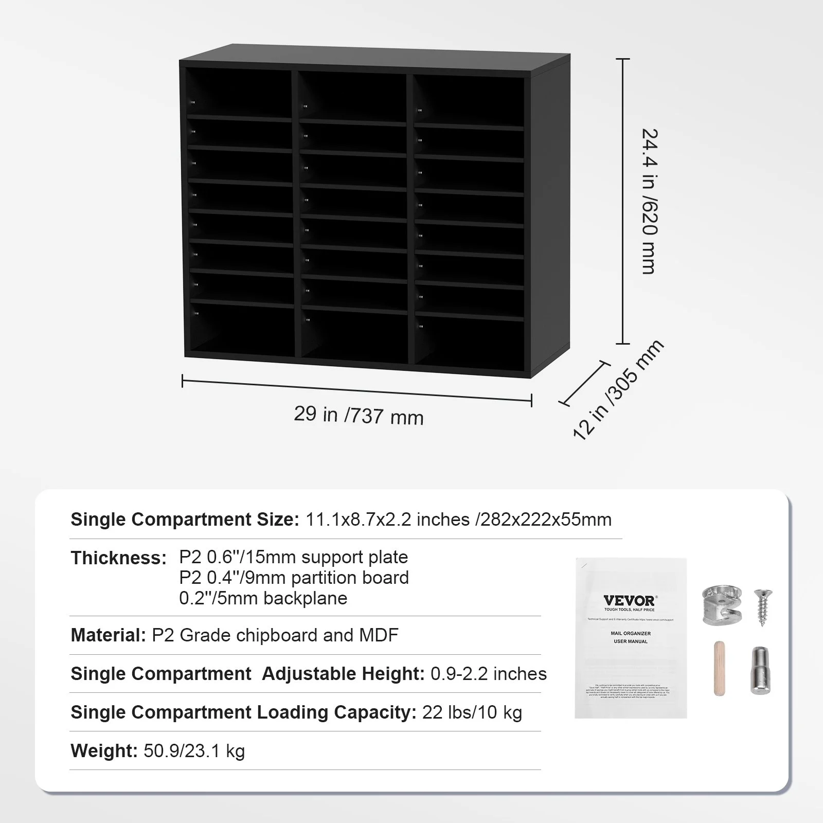 Say goodbye to cluttered desktops with VEVOR 29''x12''x24.4'' wood literature organizer. It has 24 compartments in total, arranged in 8 rows and 3 columns. You'll have ample space to store and organize books, documents, magazines, papers, and other materials. Keep your workspace neat and tidy with ease.
