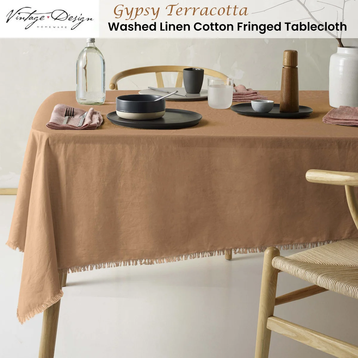 Elevate your dining space with our Vintage Design Homewares Gypsy Terracotta Fringed Washed Linen Cotton Tablecloth, it's the perfect balance between style and usability. This beautiful piece features a delicate fringe.