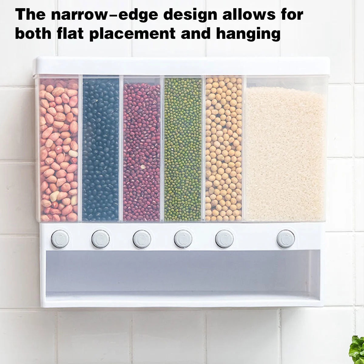 This wall-mounted automatic rice dispenser offers an efficient and organised way to store and dispense grains, rice, and cereals while saving valuable kitchen space. Crafted from high-quality plastic, the storage tank features a sealed design that keeps your grains fresh by preventing moisture and pests from entering. With adjustable partitions, you can easily sort and store different grains, making it convenient to access and manage your kitchen essentials. The push-button dispensing mechanism allows for precise portions, helping you to manage servings efficiently. Its sleek and compact design ensures a clutter-free kitchen, and installation is hassle-free with a strong adhesive kit included.
