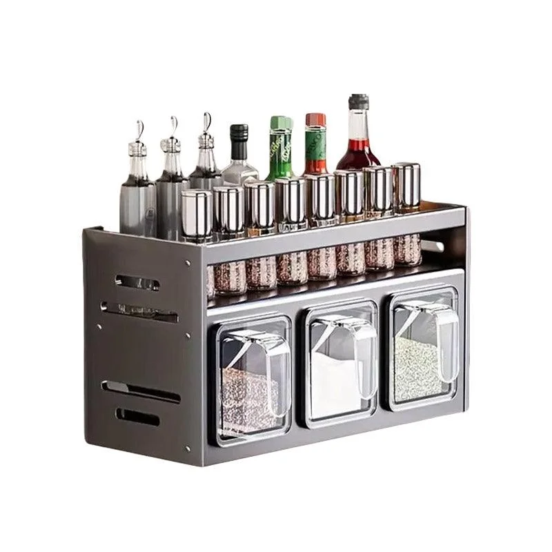 Maximize your kitchen’s organization with this wall-mounted seasoning rack. Designed to save space, it offers a practical and stylish solution to keep your spices fresh and easily accessible. The non-perforated installation method ensures hassle-free mounting without damaging your walls, while the adjustable shelves provide ample space for bottles of various sizes. Featuring independent, sealed compartments, this organizer prevents flavours from mixing and helps keep your spices dry. With its sleek gun grey finish, it adds a modern touch to your kitchen.