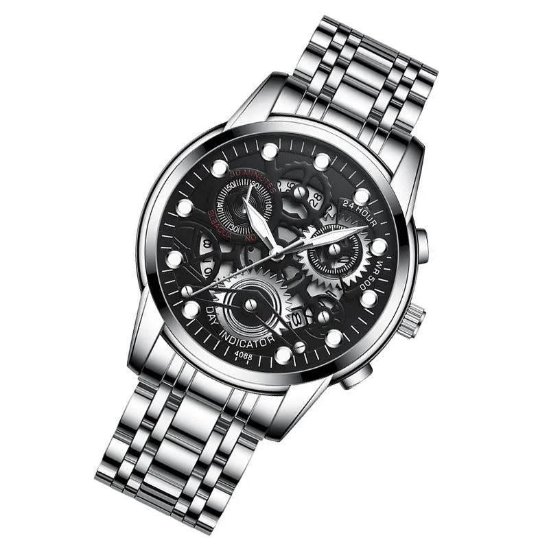 Stainless Steel Strap Quartz Watch for Men with Date and Six Pin Design - Silver Black