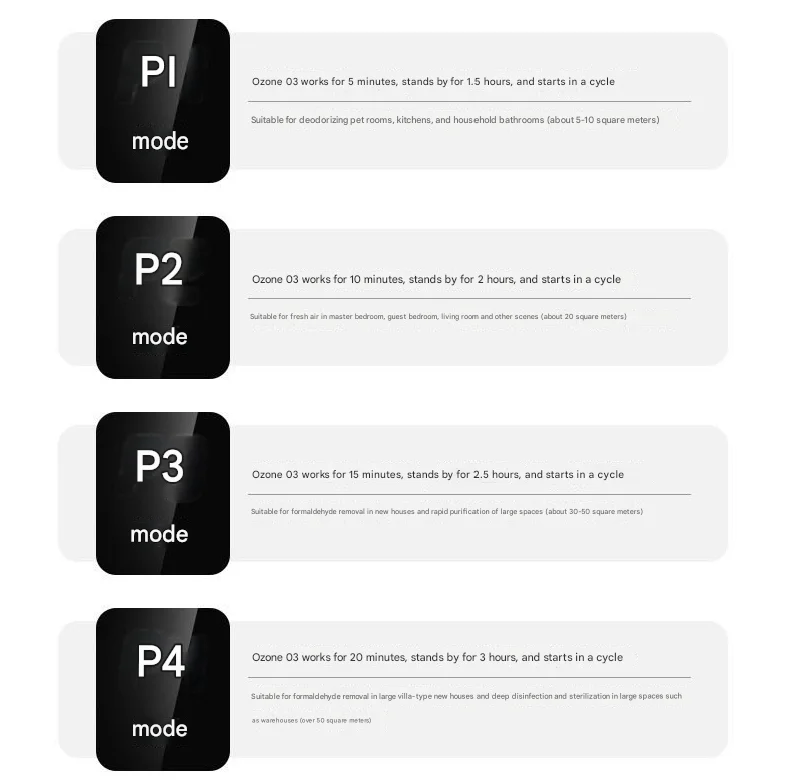 • P4 Mode: Runs for 20 mins, standby for 3 hours, then repeats. Designed for intensive sterilisation in extra-large spaces like villas or warehouses (50+ sqm).