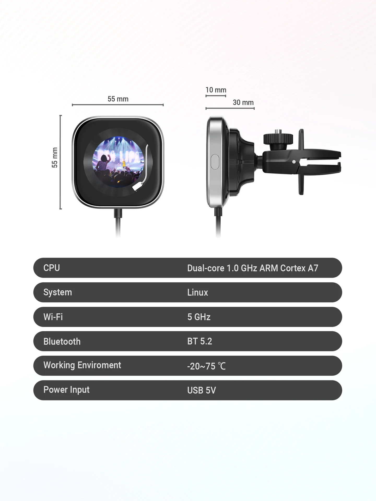 Transform your driving experience with the world's first wireless CarPlay adapter featuring a multi-functional screen. This innovative device converts your car's factory wired CarPlay to a seamless wireless connection while adding a customizable 1.6-inch display and a built-in car fragrance diffuser. Enjoy a stable, low-latency connection powered by a dual-core 1.0 GHz ARM Cortex A7 CPU, 5 GHz Wi-Fi, and Bluetooth 5.2. The customizable screen can display a digital clock, music album art, or your own personalized photos, all controlled via a companion app. The 360-degree vent clip ensures a secure and adjustable fit, and the integrated diffuser allows you to enhance your car's ambiance with your favorite scents. Experience the ultimate in-car convenience and personalization with this plug-and-play solution.