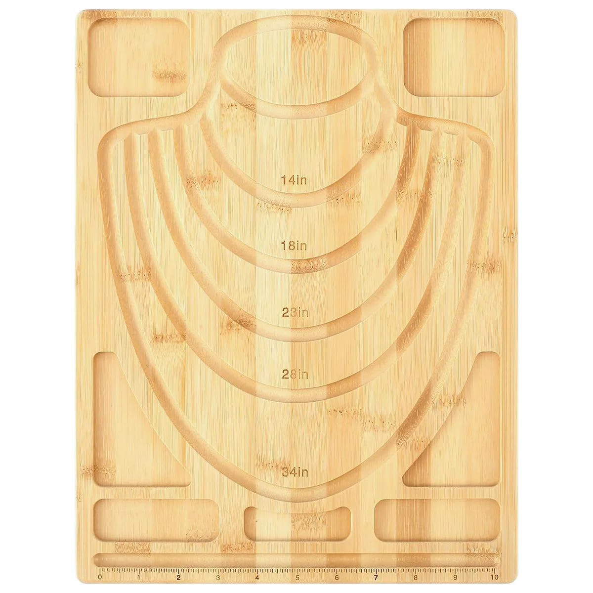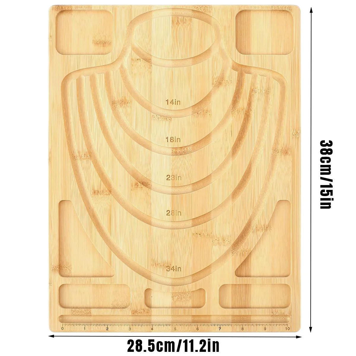Engraved Grooves with Sizes: Includes five grooves marked with sizes (14in, 18in, 23in, 28in, 34in) for designing various jewellery pieces.