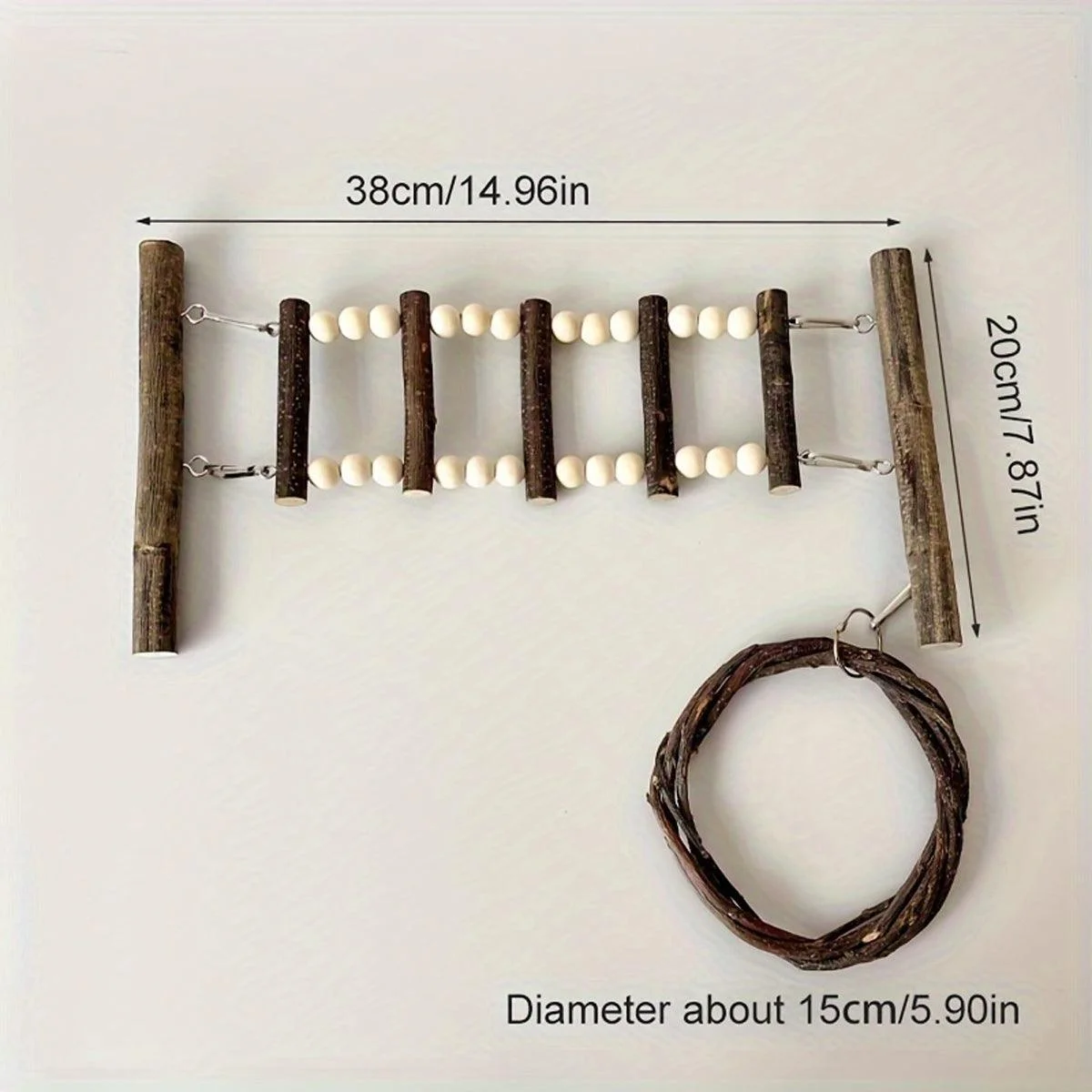 Enhance your parrot’s environment with this versatile wooden climbing ladder and swing set. Perfect for small to medium-sized birds, this set includes a durable natural wood ladder and a circular swing, offering both exercise and entertainment. Designed with multiple fixing options, it can be securely attached to your bird’s cage with either suction cups or nut washers. Made from high-quality dried logs, this set promotes interactive play while blending seamlessly with the aesthetics of any birdcage.