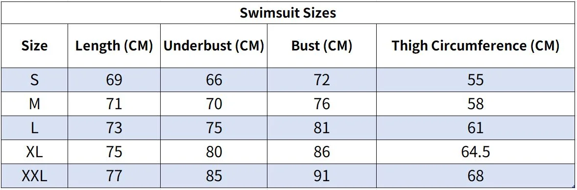 | Size | Length (CM) | Underbust (CM) | Bust (CM) | Thigh Circumference (CM) |