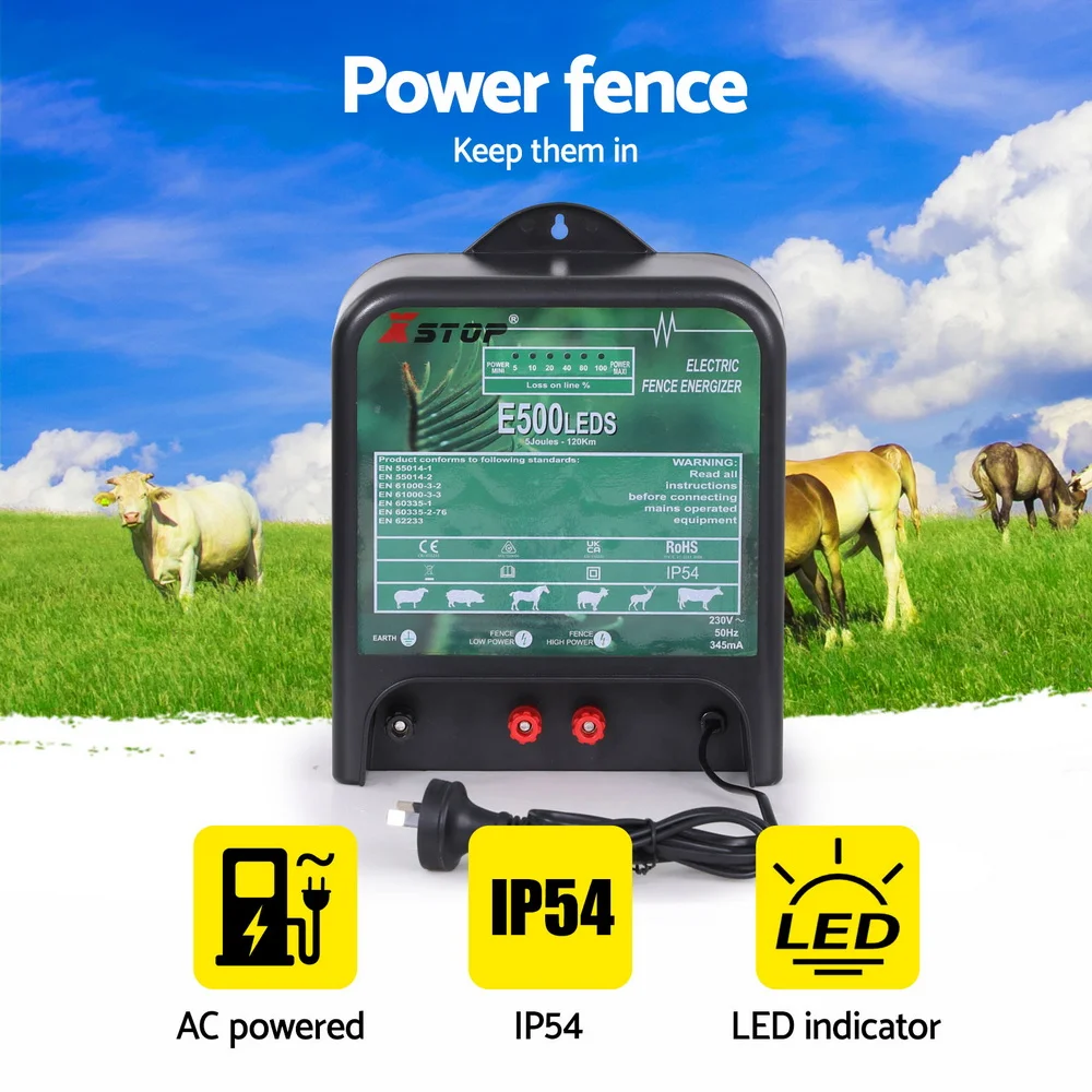 The XSTOP EL500LEDS Electric Fence Energiser designed for mains-powered operation (220V-240V AC), this robust energizer provides effective coverage up to 120km while maintaining energy efficiency at 430mA power consumption. Featuring IP54-rated weather resistance and clear LED status indicators, it ensures reliable performance in diverse conditions. With 5-joule output energy at 500 ohms and compliance with CE/ROHS standards, this unit offers durable protection against livestock breaches. Backed by a 12-month warranty, it's an ideal choice for farms requiring dependable electric fencing solutions across extensive perimeters.
